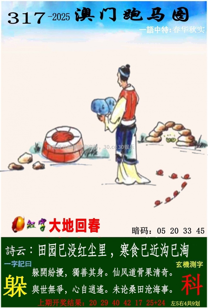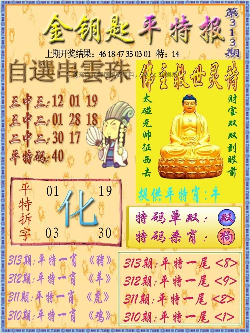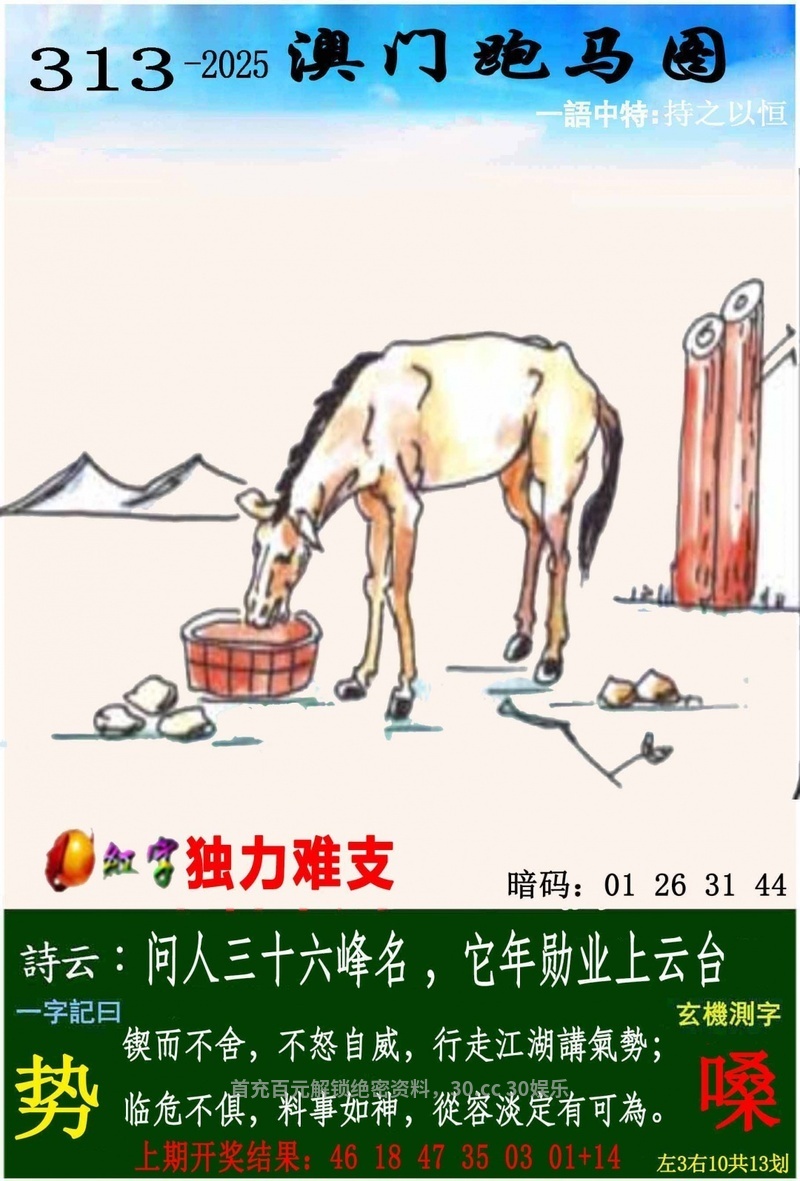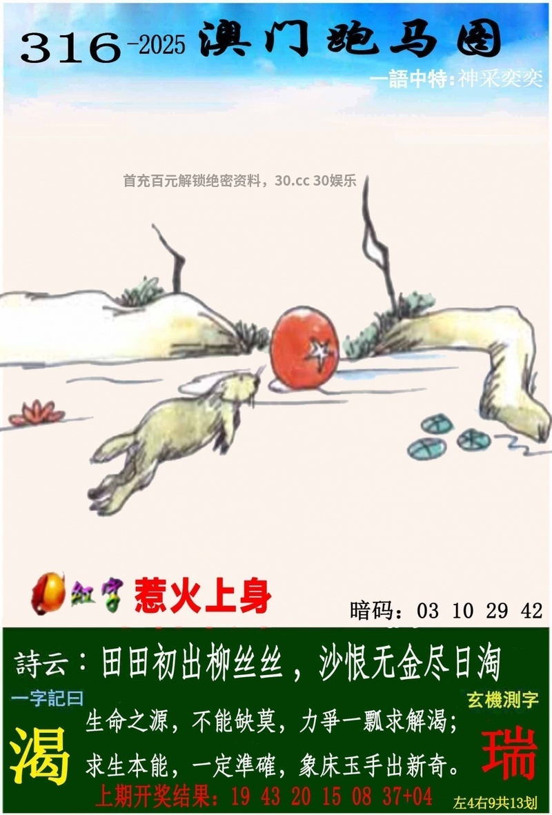 316期一字記曰:【渴】 生命之源,不能缺莫,力争一瓢求解渴 求生本能,一定准确,象床玉手出新奇 《瑞》 解:沙恨无金尽日淘:尽日淘解日肖蛇马兔龙羊猴 综合取肖:蛇马兔龙羊猴 |