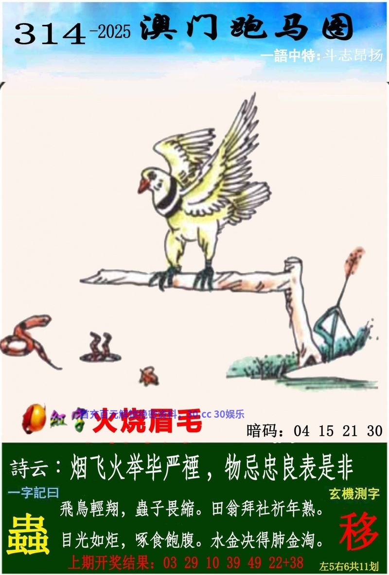 318期一字記曰:【睡】 身手娇捷,跳躍奔腾,不是龙马也精神 乌眉瞌睡,必招厄运,大祸临头难甩身 《伍》 解:大祸临头难甩身:大祸临头解凶肖猪牛狗虎鼠猴 综合取肖:猪牛狗虎鼠猴 |